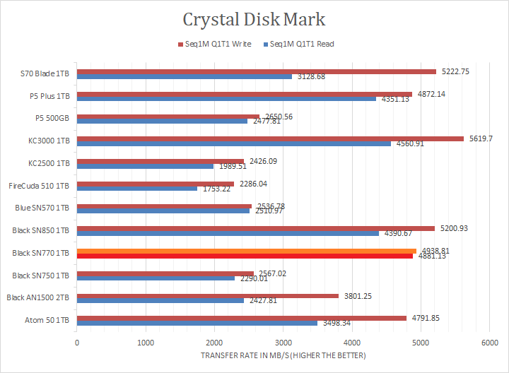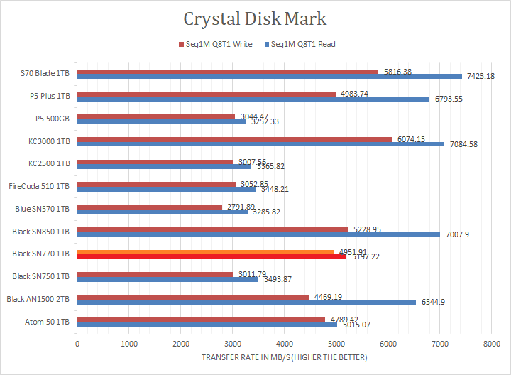 Western Digital claims the SN770 1TB's maximum read and maximum write are pinned at 5150MB/s and 4900MB/s, respectively. Looking at the read and write results of all four sections, the SN770 1TB was a bit behind in the linear read and write section against performance PCIe 4.0 NVMe drives, but the numbers were bang on compared to the specifications and expected given this is a budget drive. It performed better than all PCIe 3.0-based drives in the Seq1M Q1T1 read test, and the write results were better than anyone else, including the company's own flagship SN850 1TB.