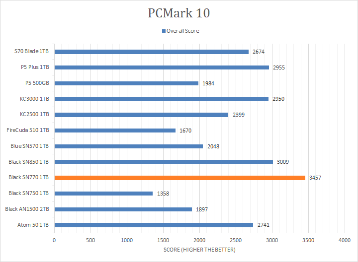 PCMark 10 is the latest version of the popular full system benchmark from UL. We used PCMark 10's Full System Drive Benchmark to test the performance of the Western Digital WD_BLACK SN770 NVMe SSD 1TB. According to UL, the Full System Drive Benchmark uses a wide-ranging set of real-world traces from popular applications and common tasks to fully test the performance of the fastest modern drives. The following traces were used and defined as follows: