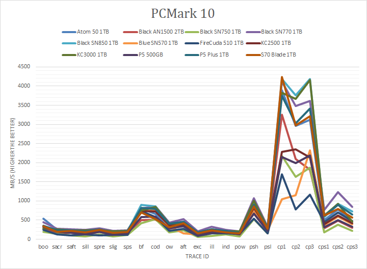 As it can be seen in our graphs above, the WD_BLACK SN770 NVMe SSD 1TB delivered leading performance overall. It was simply not in the same league as other tested PCIe 3.0 NVMe drives; handily beating them by a wide margin. In fact, it scored higher than any other SSD, including the company's own flagship WD_BLACK SN850 1TB. The final score tells a lot of the story, but the details are important as we look at the throughput of each of the twenty-three traces used. In these simulated real-life workloads, the SN770 1TB's only limitation was a lower maximum speed, but anything other than that, it was dominating. Again, I could not explain why the SN770 was so good being a DRAM-less SSD and all, but this was consistent with our other tests.