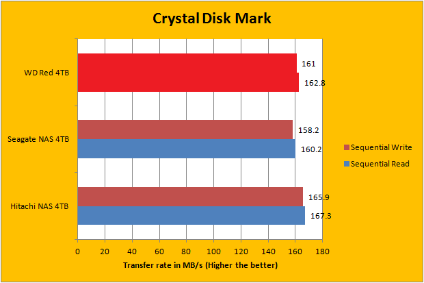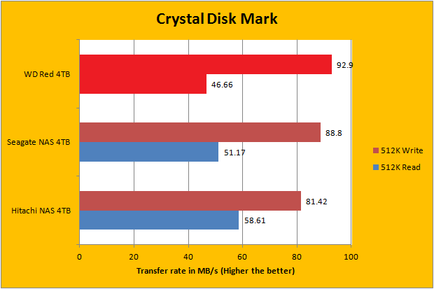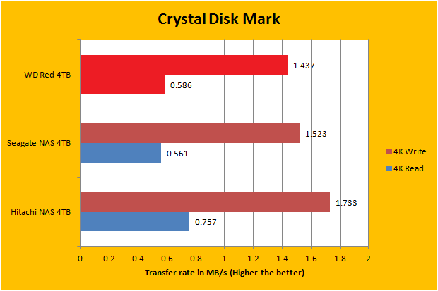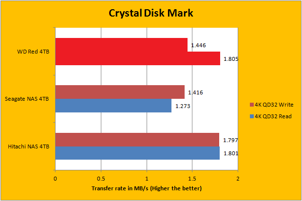 Looking at the IOPS related tests, the WD Red turned out pretty close to the Seagate; being slightly behind in write, but briefly ahead in read. The 7,200 RPM Hitachi was the clear winner here, as it was with the 4K QD32 benchmark in Crystal Disk Mark. The WD Red actually provided quite a bit faster write speed that read speed -- its write speed was actually a hair faster than the speedy Hitachi Deskstar NAS. While it cannot reach its relative-by-marriage in terms of write performance, both results still came out ahead of the Seagate NAS HDD 4TB, as you can see in our graph above.