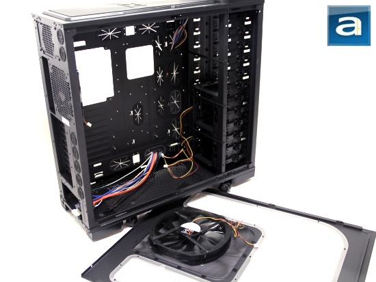 As stated previously, the Xigmatek Elysium is able to house up to HPTX sized motherboards. Other form factors compatible with this chassis include XL-ATX, E-ATX, ATX, Micro ATX, and Mini ITX. The standoff mounting holes are clearly labeled with letters that correspond with the user's manual. A set of twelve standoffs are already pre-installed onto the motherboard tray. Seen at the back is the top mountable PSU metal cover and a 140mm exhaust fan that uses a 3-pin motherboard header. At the top is a large fan area to accommodate up to three 120mm fans, three 140mm fans, or two 200mm fans. The spacious roof design also allows high efficiency 36cm radiators to be installed for water cooling enthusiasts.
