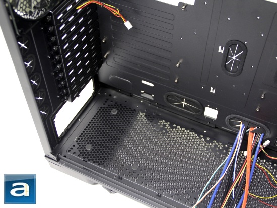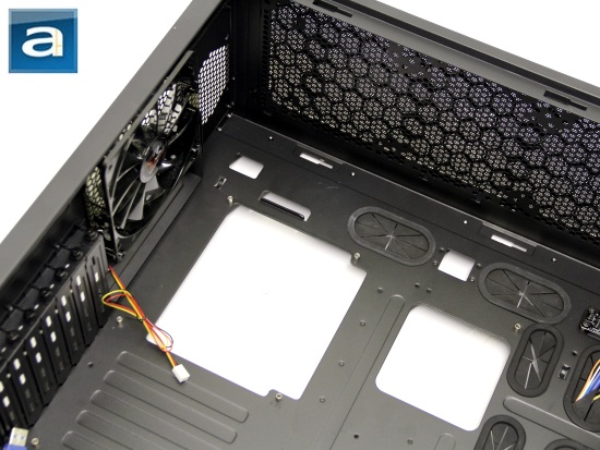 Because the case can utilize a bottom mounted power supply, we can see the usual ventilated grille. Four rubber pads are placed at the bottom to absorb vibrations from the PSU. On the picture above, you may be able to see a lining of black foam around the PSU bay. This will further absorb vibration from the power supply. The same black foam is also found at the top PSU mounting hole. Just above the bottom mounted power supply unit bay are ten expansion card slots. The expansion slots use thumbscrews to secure the slot covers as well as the installed expansion card.