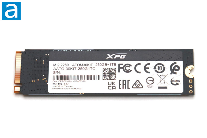 Flipping the XPG Atom 30 1TB around, there are no components of interest. Instead, a label is found here and it carries miscellaneous information such as its model name, serial number, and regulatory certifications. Like other ADATA XPG products we have reviewed in the past, this SSD is made in Taiwan.