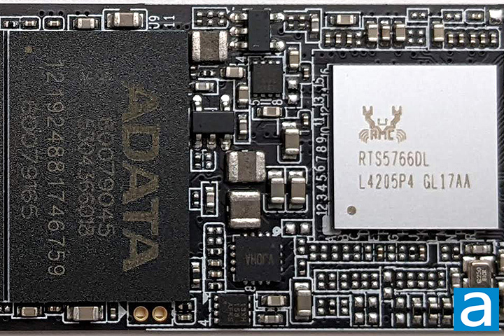Going back to the primary side of the XPG Atom 30, there are two sets of components to take note of. The first is the Realtek controller of the drive, labeled RTS5766DL. This is a NVMe solution on the M.2 socket to overcome traditional SATA bottlenecks. There is no memory found on the drive itself, but rather the memory for the controller is located within the controller. This is a bit of a disadvantage to have no DRAM, as this can affect prolonged read and write performance. To alleviate this, some SSDs without DRAM may utilize HMB, or host memory buffer, and allocate some of the system's memory as a buffer location for faster access compared to flash NAND access. The Atom 30 1TB does in fact take advantage of this, so we will see the effects of this during our tests.