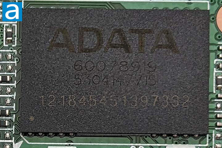 The larger black chip, the Atom 30's flash NAND memory, is a Micron 3D triple-level cells chip labeled as ADATA 60079045. There is a total of four of these NAND chips. Its total rated write endurance is 600TBW, which equates to about 329GB per day for five years. This is pretty good for a consumer drive. 24GB out of the 1024GB total capacity -- just under 3% -- is provisioned for the drive controller for overhead, so the actual usable space is 1TB, as advertised. You will see 931.5GB in Windows available for use. Specified at 2500MB/s read, 2000MB/s write, up to 180K IOPS read, and up to 200K IOPS write over NVMe 1.3 on PCIe 3.0 x4, these figures fit squarely in budget territory.