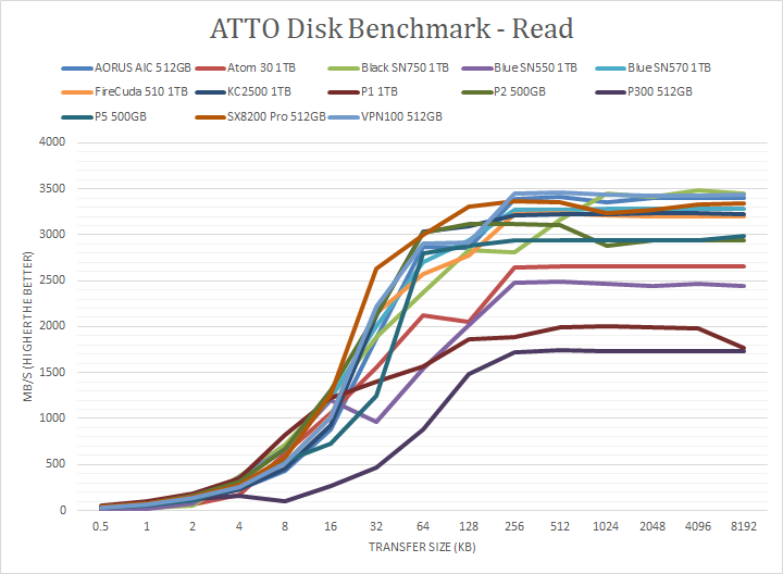 The next tests are our usual ATTO read and write tests. ATTO is an often-quoted benchmark because it is easy to use and accurate. For the most part, it is a favorite among reviewers and I have grown to embrace it as much as the next for the last little while. ATTO uses easily compressible data, so compression-heavy controllers will perform very well here. For the XPG Atom 30 1TB, this drive peaked at 2150MB/s write and 2658MB/s read. These numbers are both higher than the quoted maximum speed, which is good to see. On the other hand, it is still on the slower side of PCIe 3.0-based NVMe drives. Under the write curve, the XPG Atom 30 1TB was a bit slower to reach its peak speeds. At smaller packet sizes, it was slightly behind the Crucial P1 and Patriot P300, while being faster than some older drives like the ADATA SX8200 Pro and Patriot Viper VPN100. As for the read curve, the XPG Atom 30 1TB was the fourth slowest drive for peak speeds. Furthermore, it was quite a bit slower to reach its peak speeds, with even slower drives like the Patriot P300 being faster at the smallest packet sizes. Compared to the WD Blue SN570, both of these drives were slow under the curve, but at least the SN570 peaked at notably higher write and read numbers.