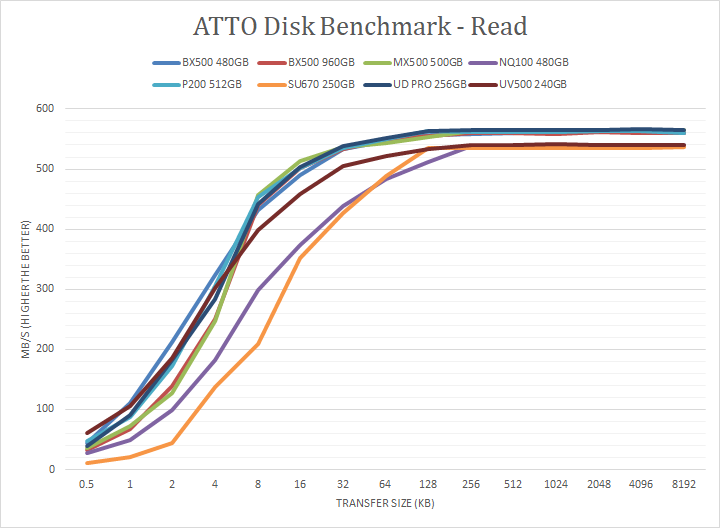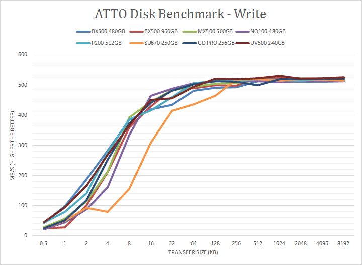 Moving to the ADATA SU670 Ultimate 250GB, the drive peaked at 519MB/s write and 537MB/s read. Once again, these numbers were higher than the quoted maximum speeds. In terms of peak speeds, the SU670 ranked in the bottom half of the drives, even if the difference between top and bottom was around 20MB/s at most. This was true for both read and write results as the SU670 had the slowest read numbers in our ATTO tests. Under the curve, the SU670 Ultimate struggled mightily. This SSD posted some of the slowest ramp up numbers, as you can see the single curved line below the rest. Neither of these results are very flattering for the SU670 Ultimate, so let us carry on.