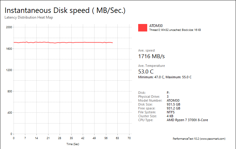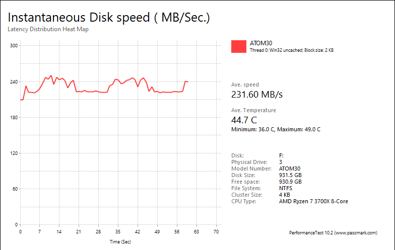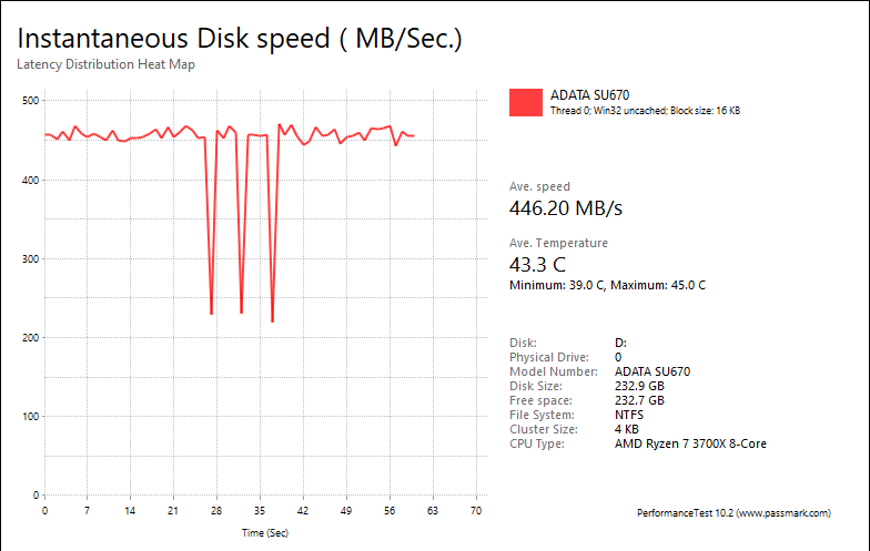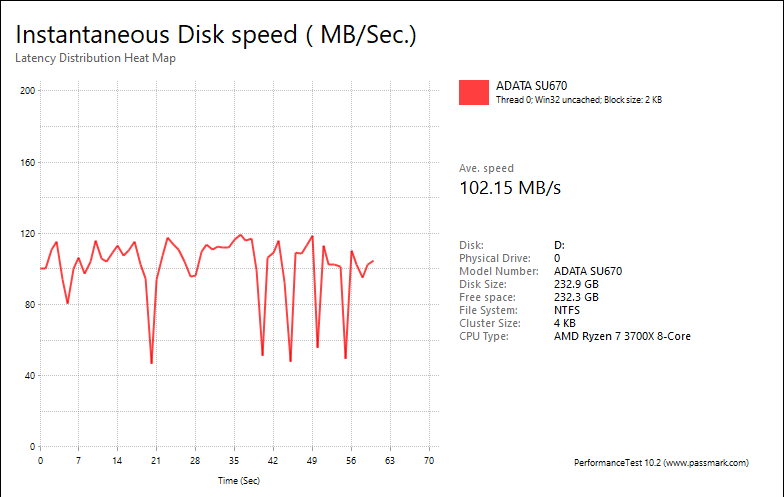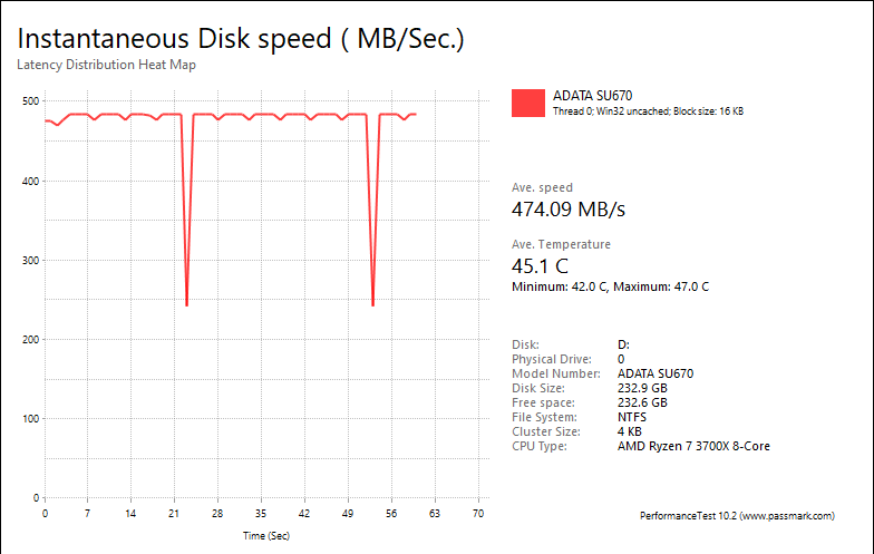 The ADATA SU670 Ultimate 250GB also put up decently good numbers in PerformanceTest 10. Results were 102.15MB/s, 446.2MB/s, 474.09MB/s, and 89.9MB/s. The only other two drives that we tested with the tenth version of this benchmark was the Lexar NQ100 and the Patriot P200, which I retested as part of this review. Both of those drives put up slower results across the board. The NQ100 had numbers of 33.67MB/s, 89.61MB/s, 448.64MB/s, and 68.65MB/s, while the P200 had numbers of 20.63MB/s, 169.96MB/s, 358.58MB/s, and 72.59MB/s. When limited to the SATA interface, the SU760 Ultimate was able to produce respectable results.