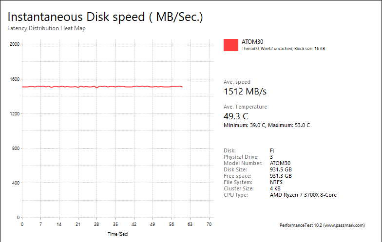 The XPG Atom 30 1TB put up decently middle-of-the-ground numbers in our first real-world simulation test. It posted numbers of 231.6MB/s, 1512MB/s, 1716MB/s, and 173.03MB/s, which were all slower than the WD Blue SN570 1TB. Compared to some other drives, the Kingston KC2500 1TB traded blows with the Atom 30, with results of 215.52MB/s, 1261MB/s, 1607MB/s, and 201.03MB/s, in the same corresponding order. Another budget focused drive, the Patriot P300, put slower numbers across the board with 225.25MB/s, 1439MB/s, 1602MB/s, 56.62MB/s speeds. Finally, the Crucial P5 beat out the Atom 30 in three of the four tests with numbers of 279.95MB/s, 1897MB/s, 2092MB/s, and 149.16MB/s. These results were mostly aligned with the other results we saw from other benchmarks.