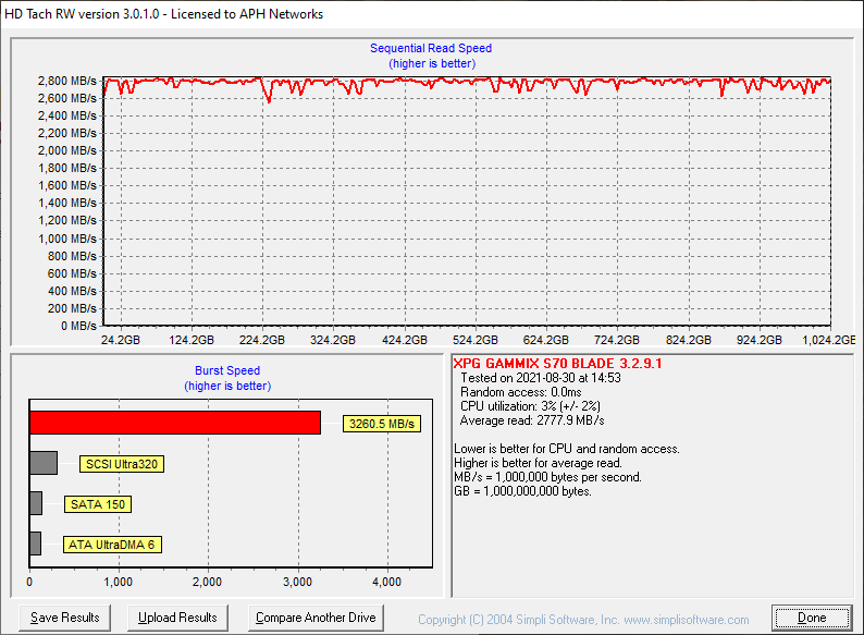 Next, I fired the XPG Gammix S70 Blade 1TB up for some testing in one of the oldest programs in the history of storage benchmarks, HD Tach. While HD Tach is more of a drag race than a clear indication of real-life performance, it is an excellent storage performance reference among SSDs with the same controller and has been our favorite benchmark long before hard drives even cracked the 50MB/s mark. With an average read speed of 2777.9MB/s, this score was better than anything I have ever tested here at APH Networks. For comparison, the Western Digital WD_BLACK SN850 NVMe SSD 1TB came in at 2523.4MB/s, while the Crucial P5 Plus 1TB posted 1692.3MB/s. For most NVMe solid state drives, we typically look for something that is faster than 800MB/s. From our experience, most drives do not crack the 400MB/s line. At the end of the day, HD Tach may not be the best test for solid state drives all the time, but these results are always interesting to look at.