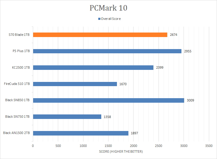 PCMark 10 is the latest version of the popular full system benchmark from UL. We used PCMark 10's Full System Drive Benchmark to test the performance of the XPG Gammix S70 Blade 1TB. According to UL, the Full System Drive Benchmark uses a wide-ranging set of real-world traces from popular applications and common tasks to fully test the performance of the fastest modern drives. The following traces were used and defined as follows: