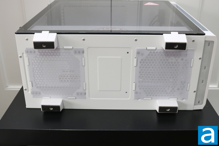On the bottom of the case, we find four fairly large rectangular feet. They have a rubber bottom, ensuring the case will not slip around on a smooth surface. As well, the feet will lift the case up just enough for the power supply to pull air in if the case is on a carpet. But carpet have much more dust, so frequent cleaning will be necessary even with dust filters. There are two dust filters on the bottom of the XPG Invader. These feel fairly flimsy and thin, but should be enough to keep the majority of the dust out. The left filter is for the power supply, and the right filter is for another 120 mm fan, which is usually an intake fan.