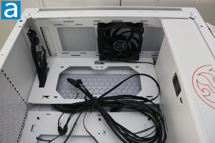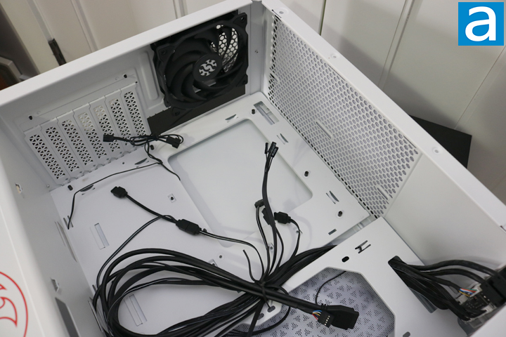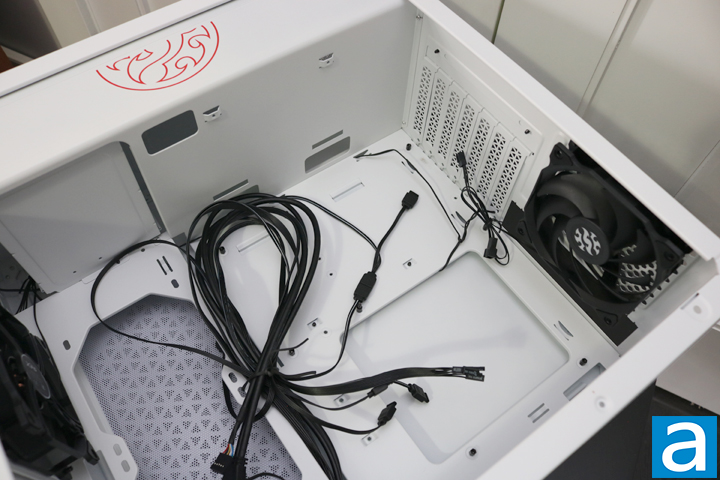 The white color scheme is continued inside the case, ensuring there is no strange contrast with the inside and outside of the case. The XPG Invader has built-in ARGB LEDs, and one thing having ARGB LEDs is the abundance of cables. It takes that much more effort to keep the wiring neat and clean. Among them are the standard USB 3.1 Type-A connector, audio block, and the small ones for power and reset buttons. There are also a few cables for the ARGB capabilities of this case, one of which is a LED light under the front intake. Otherwise, as you can see above, only two 120 mm fans are included.