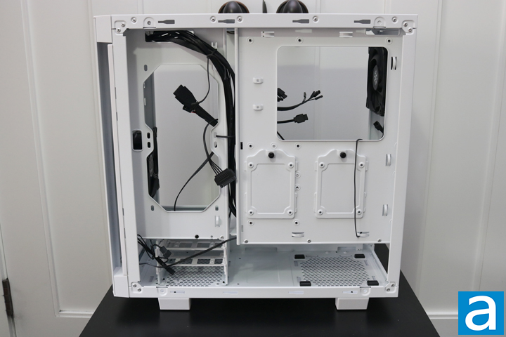 It has become commonplace for cases to feature a power supply shroud, which improves organizing cables tenfold. The XPG Invader is no different with a solid white shroud. On top of the shroud is room for two 2.5'' SSDs. There are three cutouts in the shroud for cable management. The one closest to the side panel is for the GPU power cable, while the two closer to the motherboard tray is for all of the small connectors. Having two is a welcome addition, since not all cables go to the same place. The more options a case provides for cable management, the better. Not only does the shroud keep the case neat, but it also separates the case into two temperature zones: The first being the main area with most of the components, and the second being the power supply and any hard drives installed on the bottom.