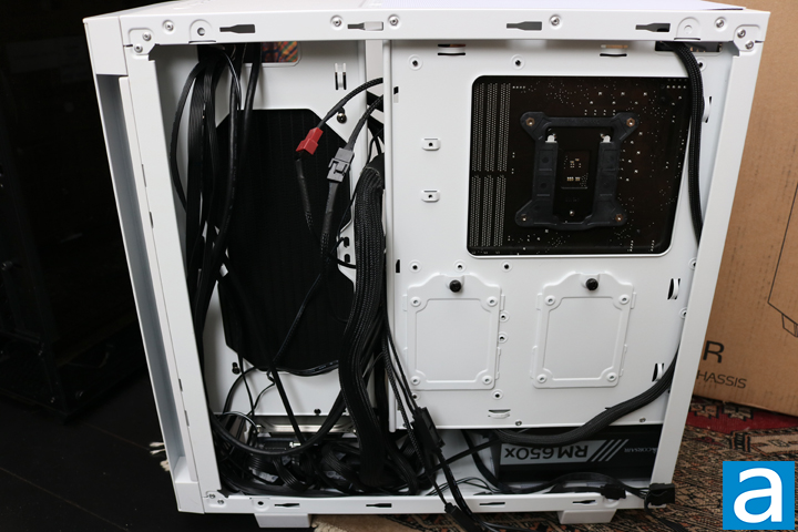 I did not put much effort into cable management, so it was a bit messy behind the motherboard tray. That said, the XPG Invader lacks many integrated cabling options like tracks or built-in Velcro straps found on modern cases. There are cable tie-down points though. There are a lot of cables because of the ARGB capabilities of the case and the ARGB LEDs of my cooler. That aside, the XPG Invader also has a nice side panel mechanism. There are not a few tabs that need to fit into specific slots. Instead, it is more like a rail. This makes it a lot easier to close the case with cables spilling out the back.