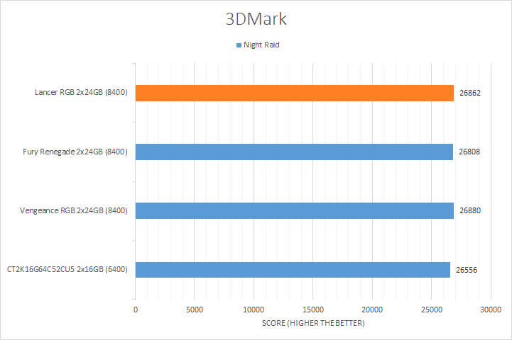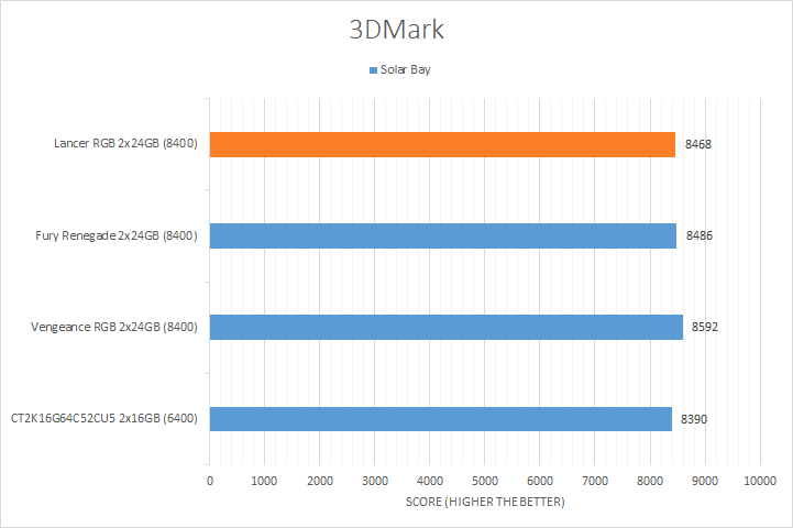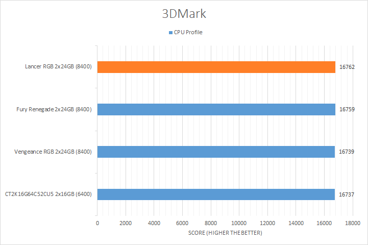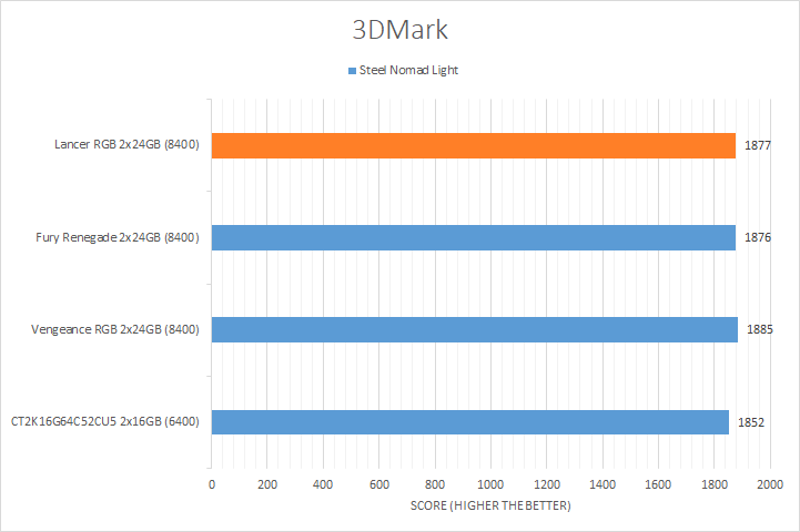 As you can see in our graphs above, the Corsair Vengeance RGB DDR5-8400 2x24GB, Kingston FURY Renegade DDR5-8400 2x24GB, XPG Lancer CUDIMM RGB DDR5-8400 2x24GB, and Crucial CT2K16G64C52CU5 DDR5-6400 2x16GB remained close to each other, showing memory bandwidth played a relatively minor role in these tests.