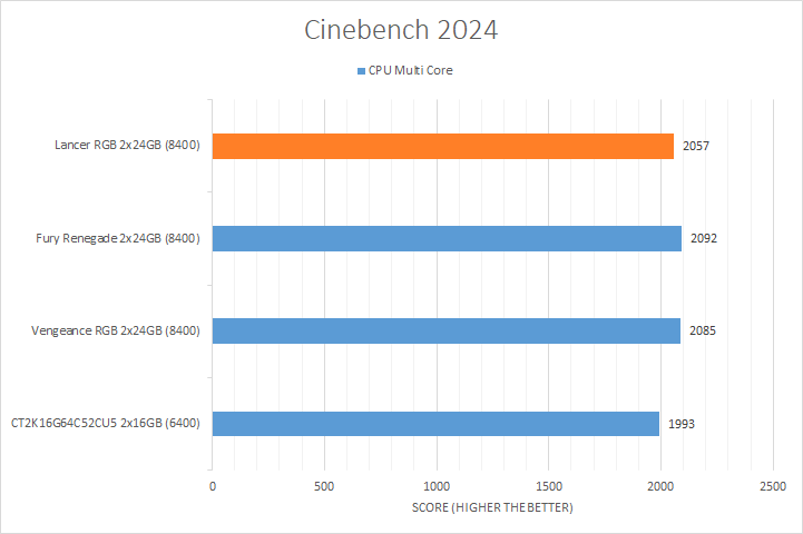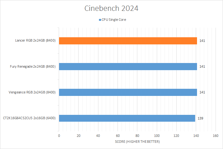 As you can see in our charts above, there was a small but measurable difference between different RAM models in the CPU Multi Core test, even among DDR5-8400 kits. The CT2K16G64C52CU5 did come in last due to its memory bandwidth limitation, which was expected. In the CPU Single Core test, all DDR5-8400 kits, including the XPG Lancer CUDIMM RGB, tied for first, but the difference was basically negligible with a two point advantage over the DDR5-6400 Crucial.