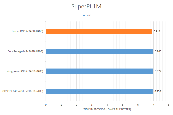 We have always included SuperPi in our benchmark results, because it is a quick and dirty run that always proves to be interesting. It is neither the fastest way to calculate Pi nor is it the most challenging. But being an enthusiast at heart, this program has always provided interesting results for showing off your overclocking prowess on your favorite online outlet. All the results regardless of model and bandwidth were within a hair of each other.