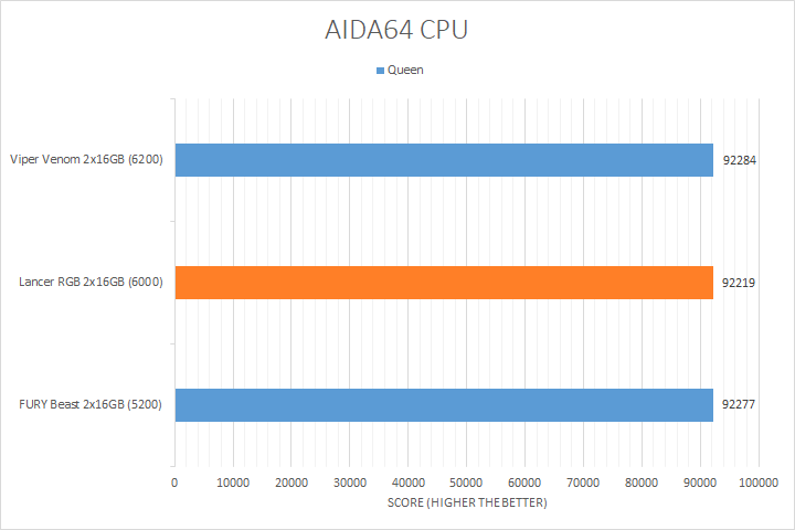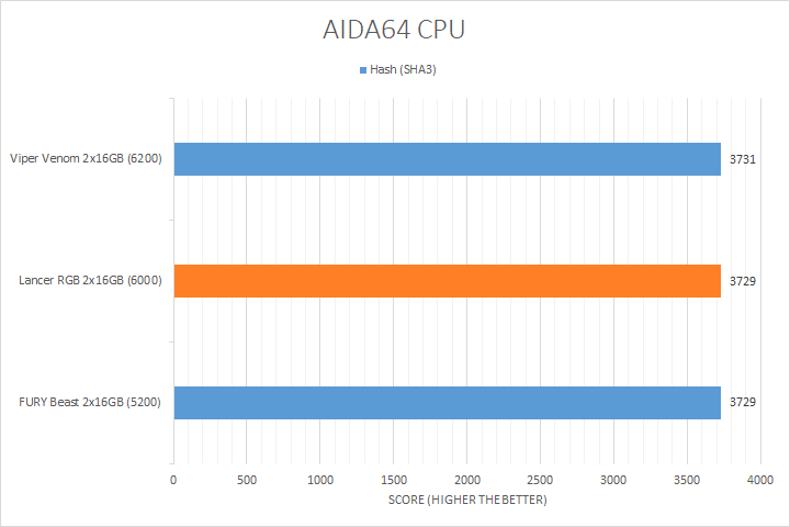 Taking a look at the first set of AIDA64 tests, the CPU benchmarks, you can see for the most part, all of our DDR5 memory kits performed very close to each other. The only test with notable differences was the Photoworxx test, where the results seemed to scale with the operating transfer speeds of the memory. As such, the XPG Lancer RGB DDR5-6000 2x16GB kit result was in between the other two kits. Otherwise, the rest of the tests showed all of these kits performed relatively equally, with less than a percentage difference for the other four results.