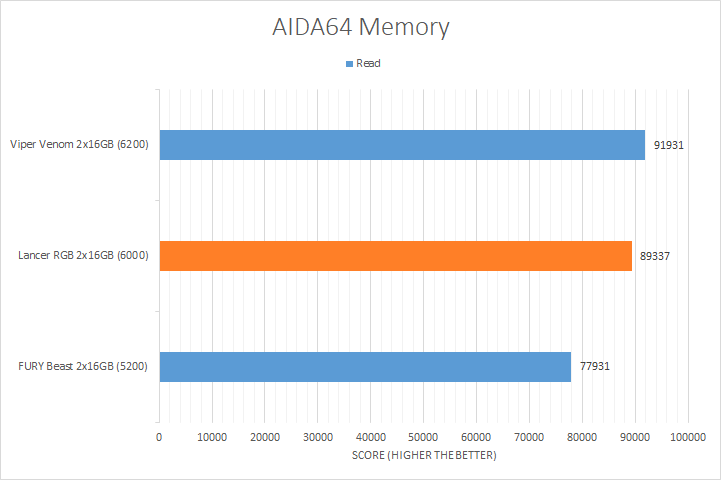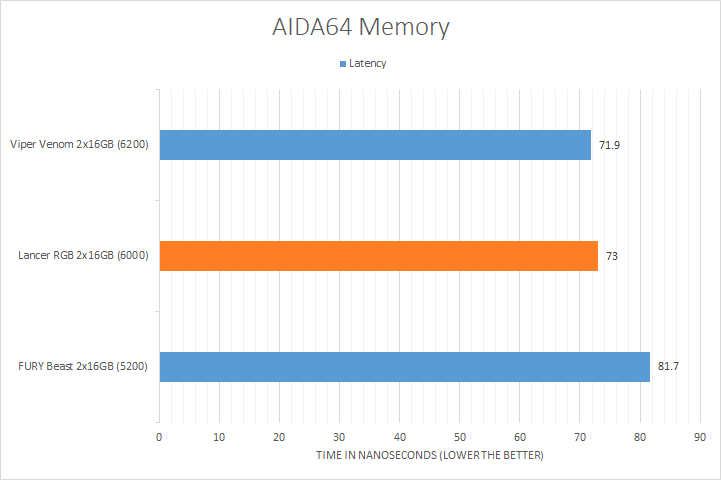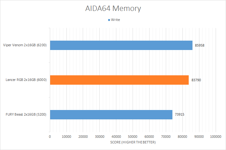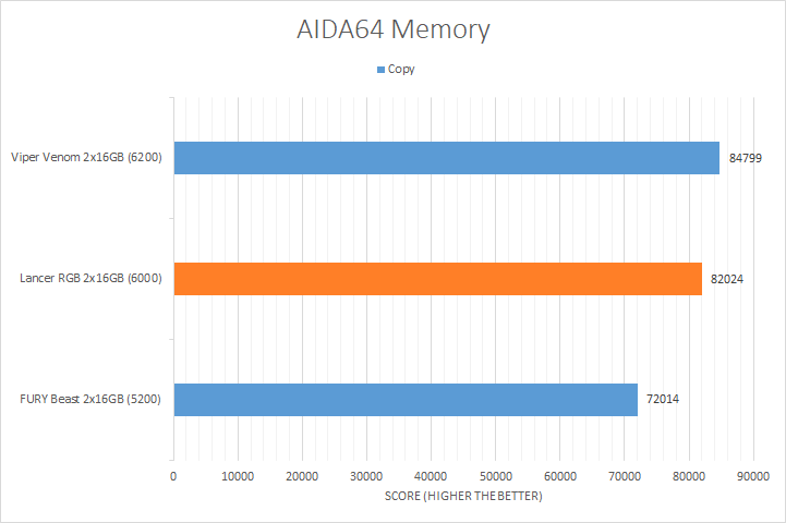 Our third set of AIDA64 synthetic tests for our review today are the memory benchmarks. Traditionally, in pretty much all the benchmarks, higher memory bandwidth RAM kits are generally favored, whether it is the Copy, Write, or Read results. Operating at DDR5-6000, the XPG Lancer RGB placed second in all of these tests, which again is not surprising given the operating transfer rate sits in between the other two kits.