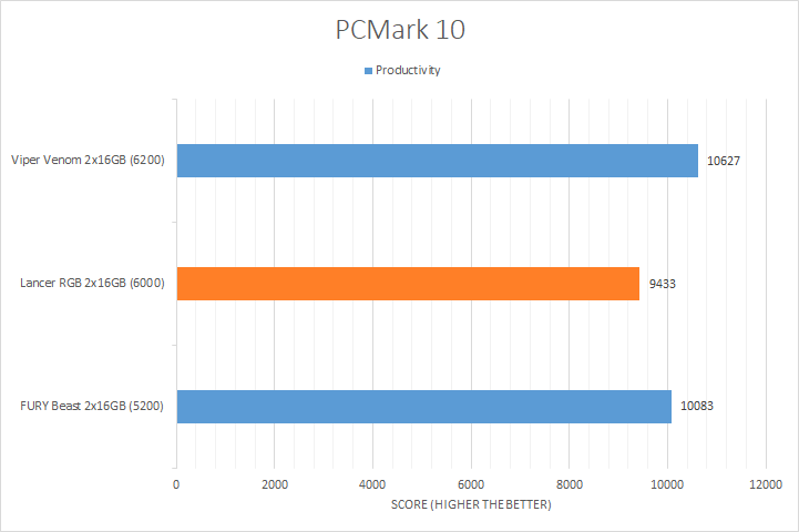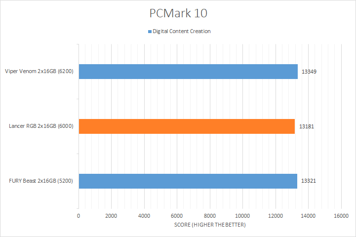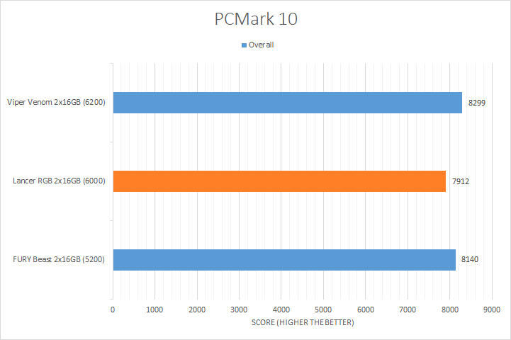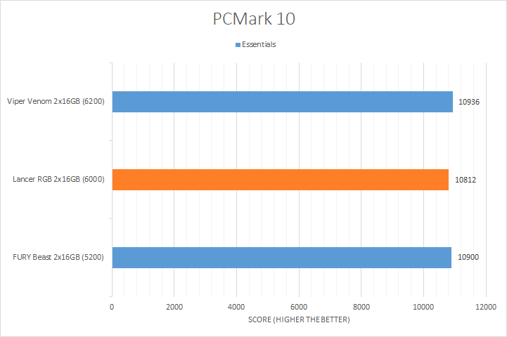 PCMark 10 is the popular full system benchmark from UL. A standard benchmark run provides scores in three categories, which includes Essentials, Productivity, and Digital Content Creation. Wrapping up all three categories is an overall score in the end. This is a synthetic test that aims to emulate real-world conditions, which provides interesting insight to the performance of your system. From our results above, the XPG Lancer RGB performed the worst in every test. It was also the lowest outcome overall, with the primary contributing factor being its poor Productivity score.