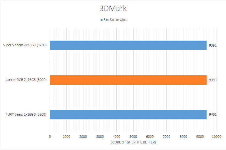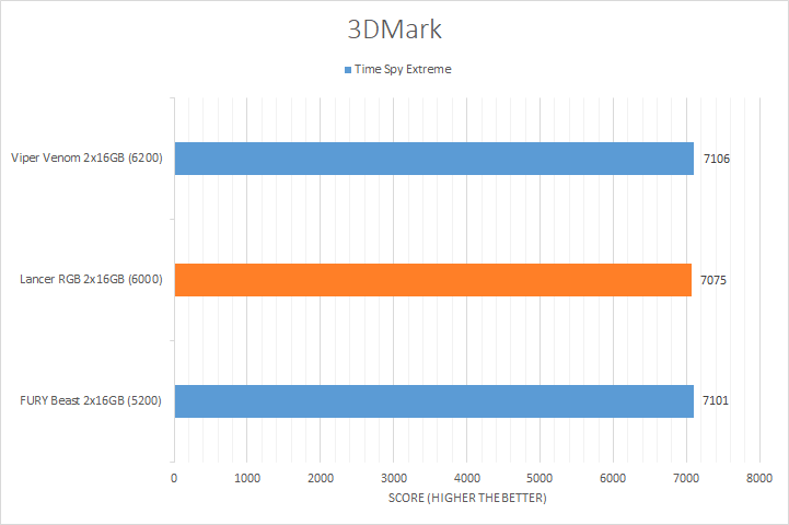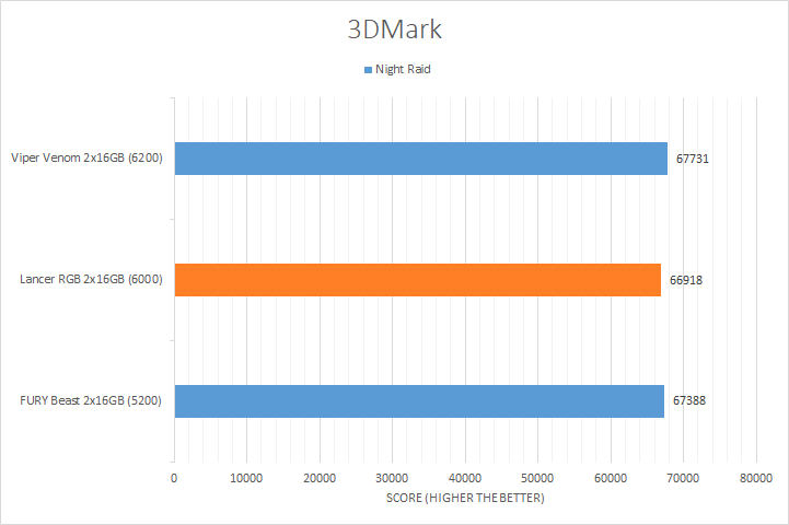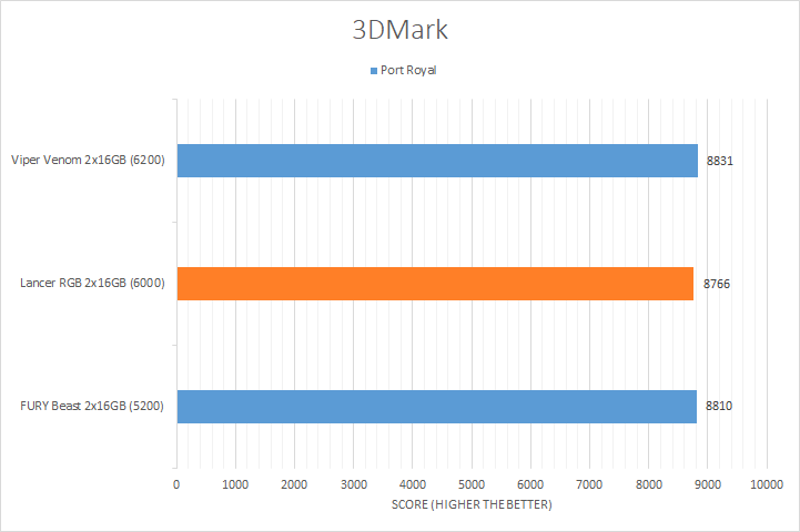 Similar to UL's PCMark 10, 3DMark is yet another favorite among enthusiasts and reviewers alike. In fact, it has been part of the APH Networks' battery of standard benchmarks since the very beginning. The latest iteration of 3DMark is available in a series of presets. We included Port Royal, Time Spy Extreme, Fire Strike Ultra, and Night Raid. Port Royal is for real-time ray tracing, Time Spy Extreme tests 4K gaming with DirectX 12, Fire Strike Ultra tests 4K gaming with DirectX 11, and Night Raid is a DirectX 12 test for PCs with integrated graphics. From the graphs above, you can see all of our kits were relatively close, regardless of the memory bandwidth. The largest margin was found in the Night Raid test with a percentage difference of 1.2% from the highest to lowest. This is not surprising, as these tests are still more dependent on the GPU used in testing and this is reflected by the small variations in the results.