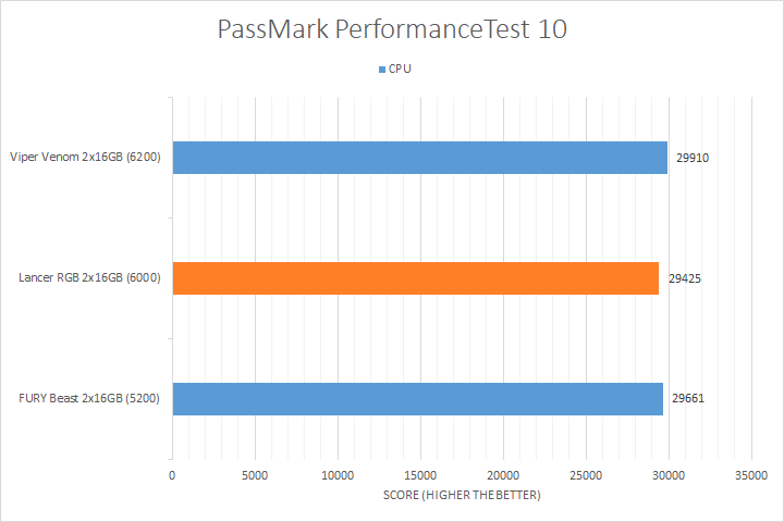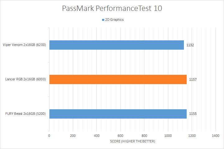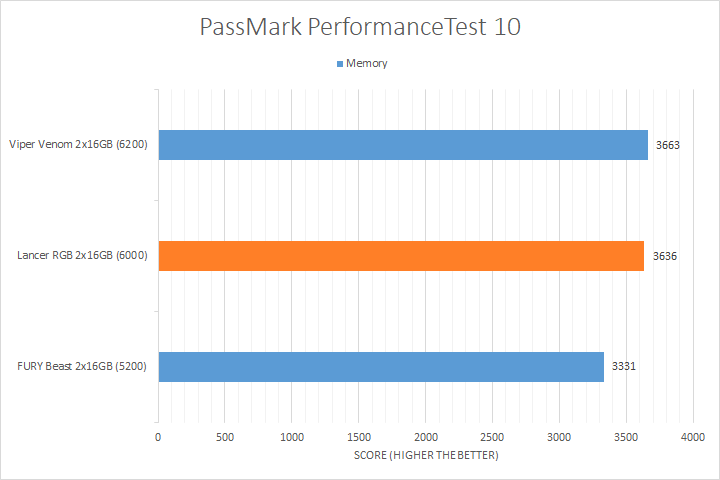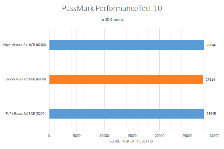 PassMark PerformanceTest 10 is used to evaluate four different areas of our system; coming down to the CPU, RAM, 2D Graphics, and 3D Graphics. It takes a somewhat different approach in obtaining results compared to other programs, which is why we like to use it, haha. PassMark Performance Test 10's memory benchmarking tool is the only test in our setup that takes memory capacity into account, but it does not seem to account for anything above 16GB from our past experience. The memory benchmarking tool did account for the differences in transfer rates, as the XPG Lancer RGB again landed in between the slower Kingston FURY Beast and faster Patriot Viper Venom RGB. Otherwise, the results between all three of the kits were close to each other.