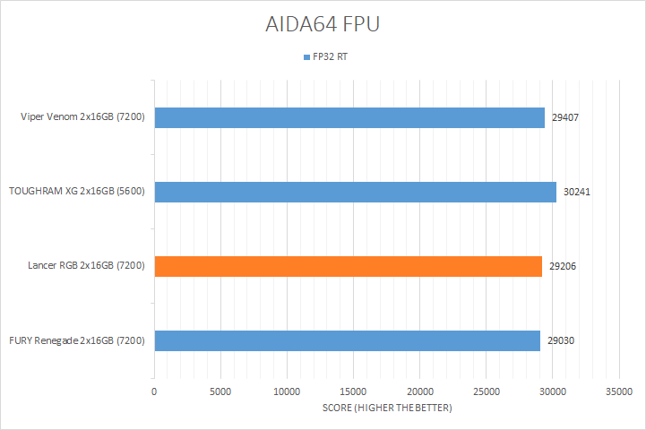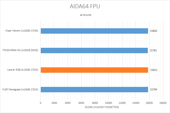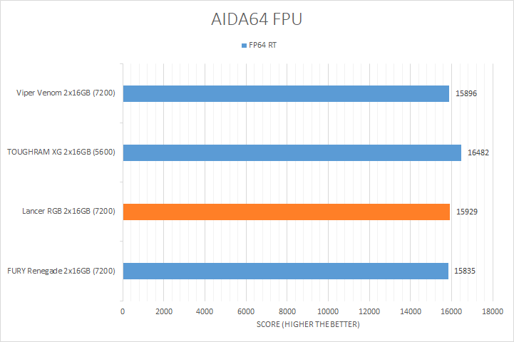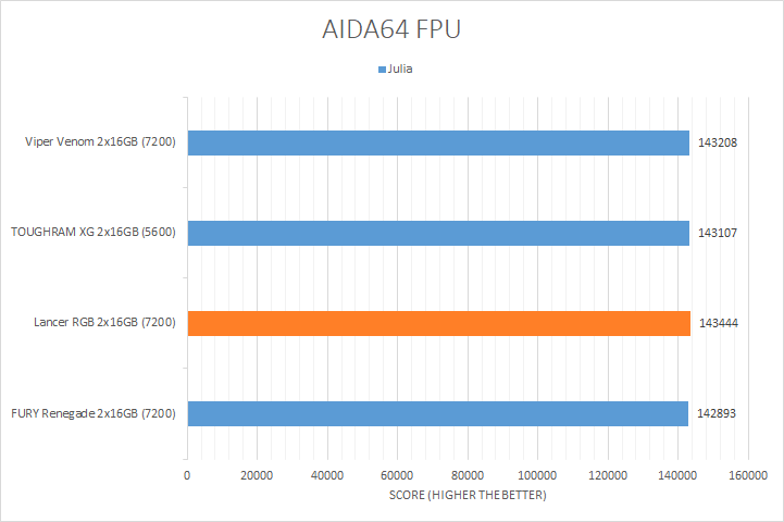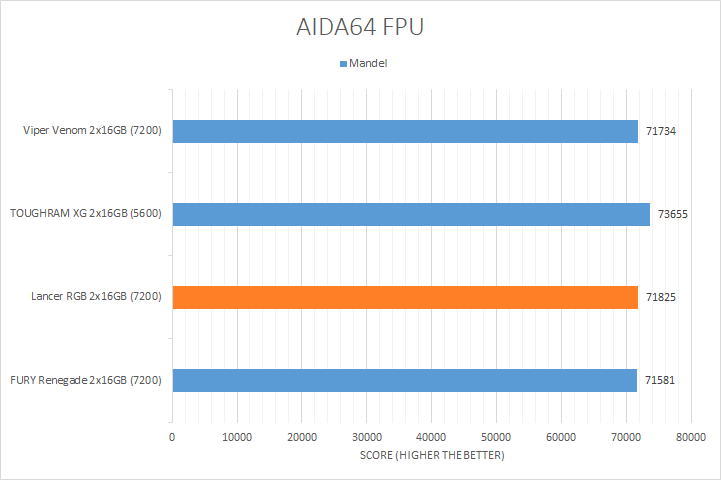 Usually, AIDA64's FPU benchmarks are the least exciting of all when writing a RAM review. This is because the way results are obtained is usually highly dependent on the tested processor, so much to an extent that the outcome is typically irrelevant to the speed or latencies of the installed memory modules. As you can see in our graphs above, all the results were within a few percent of each other. There were three results where the difference was more noticeable, which were the Mandel, FP32 RT, and FP64 RT tests. The highest bandwidth Lancer, FURY Renegade, and Viper Venom kits were measurably slower than the Thermaltake TOUGHRAM XG RGB D5 DDR5-5600 2x16GB, which was surprising. At the end of the day, they were almost all reasonably within the same ballpark as each other.