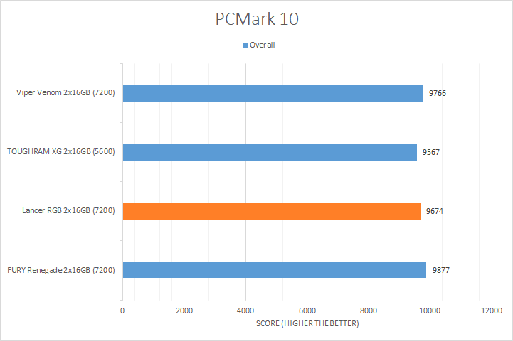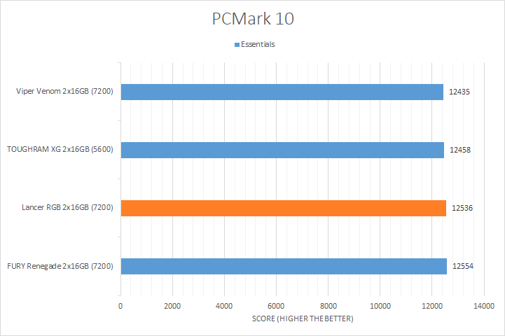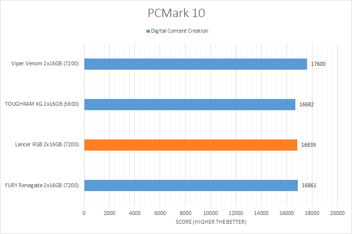 PCMark 10 is the latest version of the popular full system benchmark from UL. A standard benchmark run provides scores in three categories, which includes Essentials, Productivity, and Digital Content Creation. Wrapping up all three categories is an overall score in the end. This is a synthetic test that aims to emulate real-world conditions, which provides interesting insight to the performance of your system. There was some minor variance in the results of the tested kits, which you can see in our graphs above. Regardless, the DDR5-7200 kits consistently scored a little bit better than the DDR5-5600 kit with the exception of the Essentials test. The XPG Lancer RGB DDR5-7200 2x16GB consistently traded blows with the Patriot Viper Venom DDR5-7200 2x16GB and Kingston FURY Renegade DDR5-7200 2x16GB despite being rated at the same speed but different latencies.