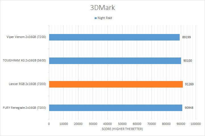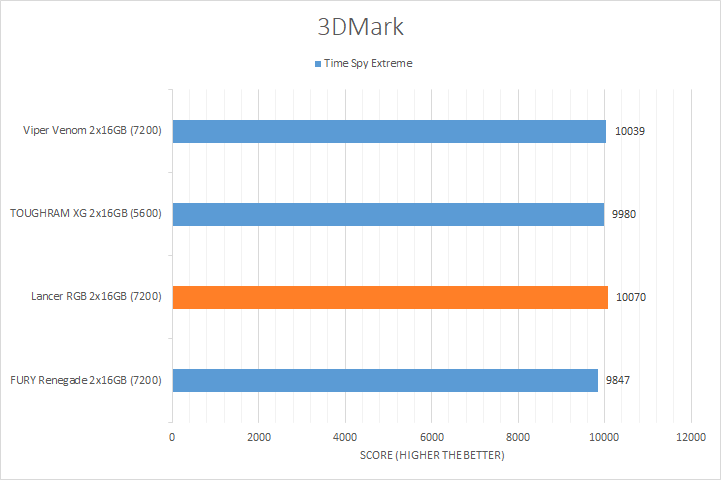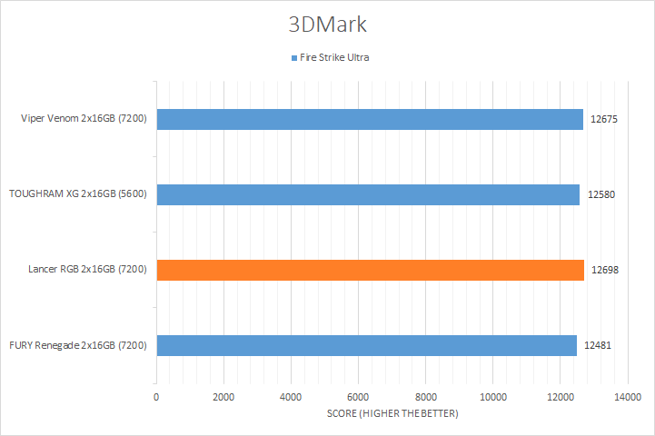 Like UL's PCMark 10 benchmarking suite, 3DMark is yet another favorite among enthusiasts and reviewers alike. In fact, it has been part of the APH Networks' battery of standard benchmarks since the very beginning. The latest iteration of 3DMark is available in a series of presets. We included Port Royal, Time Spy Extreme, Fire Strike Ultra, and Night Raid. Port Royal is for real-time ray tracing, Time Spy Extreme tests 4K gaming with DirectX 12, Fire Strike Ultra tests 4K gaming with DirectX 11, and Night Raid is a DirectX 12 test for PCs with integrated graphics. As you can see in our graphs above, the XPG Lancer RGB DDR5-7200 2x16GB remained very close with the Patriot Viper Venom DDR5-7200 2x16GB, Kingston FURY Renegade DDR5-7200 2x16GB, and Thermaltake TOUGHRAM XG RGB D5 DDR5-5600 2x16GB, showing memory bandwidth played a very minor, if not negligible role in these tests.