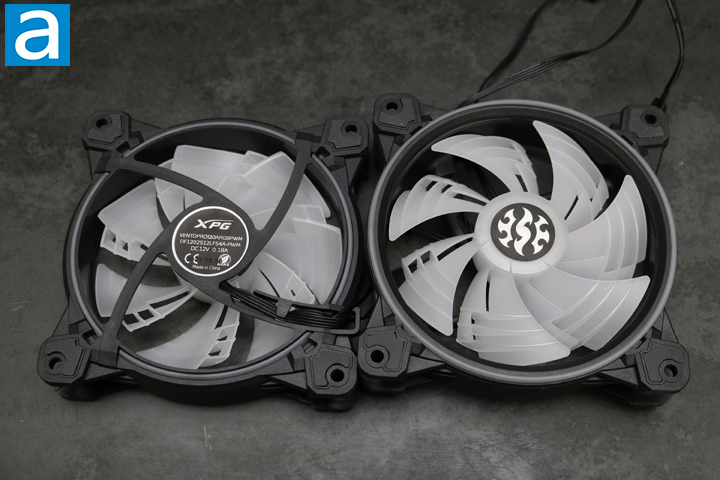 Two 120mm fans are included in the XPG Levante 240. They both have ARGB lighting and connect well with the water block to create a unified look. They have fluid dynamic bearings, which will last a while and hopefully be quiet. The fans will spin at 600 to 2000RPM with static pressure of 1.42mm-H2O. The airflow is 61.5CFM with noise level of 34dB. The fans should be good at effectively providing air for the radiator. We will see on the next page on how they perform.
