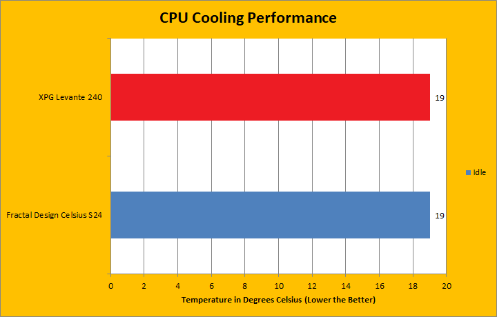 After idling the computer for more than an hour, the temperature stabilized at 19 degrees Celsius, which is good. Both coolers were able to keep the processor right at room temperature during this time. The 120mm fans' RPM were also fairly slow at this point, so it was nice and quiet. However, there is a high-pitched whine coming from the pump of the XPG Levante 240. I always find the idle tests to be a very small indication of a cooler's overall performance, so let us not waste more time and have a look at the load results.