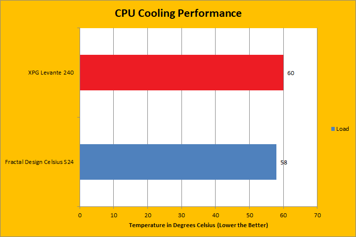 Each cooler was allowed time to stabilize their temperatures before a final read was taken. The XPG Levante 240 performed slightly worse than the Fractal Design Celsius S24. However, being able to stabilize the processor at 60 degrees Celsius was no small feat. I will also mention that both coolers did have the same absolute maximum temperatures. Both reached 71 degrees Celsius at one point during the stress test, however, they did not remain there very long. Overall, the XPG Levante 240 impresses with its ability to cool the processor.