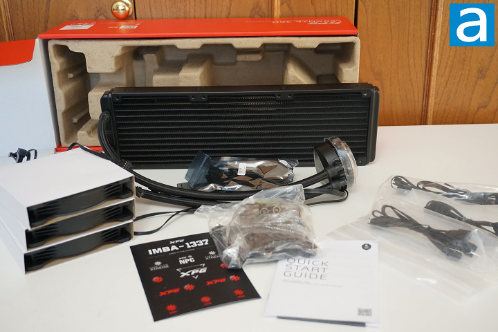 Upon opening the retail box, you will find everything is well-packed. I paid special attention to the fins on the radiator, since they are relatively easy to bend. I did not find any unacceptable damage on the fins, meaning the packaging provides good protection to its contents. Aside from the all-in-one water cooler, three addressable RGB LED 120mm fans are another set of major components you will find in the retail box. The installation of XPG Levante 360 requires smaller accessories, and they are all contained in a number of plastic bags. A bunch of screws, washers, and mounting kits for both Intel and AMD sockets are found in those bags. Due to the ARGB LED feature of this AIO, a lighting controller is included out of the box, and it is packaged inside an antistatic bag. The printed installation guide is also provided for the user's convenience. I did not find any thermal paste, since it has been pre-applied to the water block already. I would prefer to have a tube of thermal paste provided rather than having thermal paste pre-applied, just in case I need to install this kit to a different computer in the future.