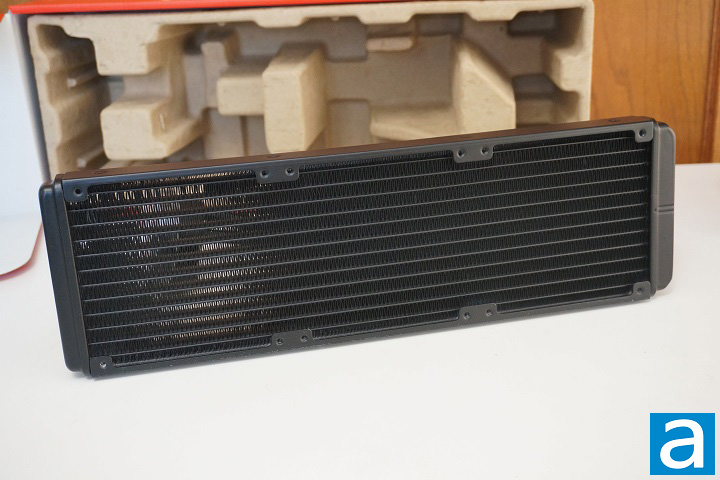 Now, let us focus on the all-aluminum radiator on the Levante 360. The 360 in the product name suggests that the radiator has a size of 360mm, which means it can hold three 120mm fans. The radiator is made out of aluminum, which strikes a great balance between thermal conductivity and weight. In terms of the size, the radiator of XPG Levante 360 measures 394mm in length, 120mm in width, and 27mm in thickness. The measurements are standard for a 360mm all-in-one liquid cooler. The build quality of this radiator is pretty good. There was no sign of damage on the fins except for a small bent area out of the box. The paint looks to be in good condition as well.