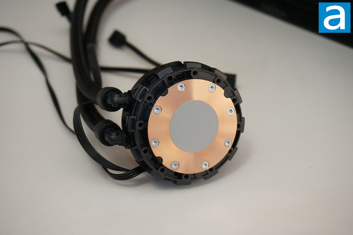 Let us move on to take a look at the water block of the XPG Levante 360. XPG made the contact area with your CPU copper. The contacting surface looks like a copper shield after the protection film is removed. Personally, I really like seeing the pure copper color on the base, but in practicality, nickel plated is better in the long run since nickel is more resistant to corrosion. What we cannot see from the outside is the 0.15mm micro channels at the back of the copper base. According to XPG, these micro channels are thermal optimized to improve heat dissipation. With the help of the pre-applied thermal paste, heat can be efficiently transferred from the CPU to the AIO cooler.