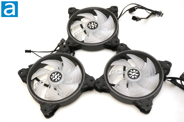 The three fans of the XPG Levante 360 are vibrant dual-ring 120mm ARGB LED fans with fluid dynamic bearing and 4-pin PWM design. Thanks to the addressable RGB LED lighting, these fans can display any color combination by the use of the included ARGB LED controller or compatible motherboard. All of the lights in the Levante 360 water cooler are connected using 3-pin LED cables. To reduce vibrational noise, rubber pads are used around the mounting holes. For the fan blades, a ribbed edge can be found to cut down the turbulence noise. In terms of cooling performance, the included fans of the Levante 360 can produce up to 1.42mmH2O air pressure and 61.5CFM airflow. These figures are the same as the fans included with the XPG Levante 240.