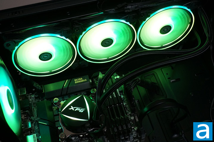 I am the kind of person who really cares about the noise level of my computer. In this case, I had one water pump, three 120mm fans on the radiator, and one exhaust fan running inside the case. On a scale of 0 to 10, where 0 is totally silent and 10 is a jet taking off, I would rate the XPG Levante 360 at 1.0/10 and 2.0/10 regarding noise emissions at idle and load, respectively. In fact, I hardly noticed any difference in terms of noise during the two CPU tests. The low overall noise level is mainly due to the use of those included 120 mm fans that have fluid dynamic bearing, rubber padding, and the ribbed edge on the blades. We had pump noise issues in the past with the Levante 240, but it looks like this is not an issue with the Levante 360. After all the tests were done, I can say the XPG Levante 360 is a well-designed and well-built water cooler with strong CPU cooling performance.