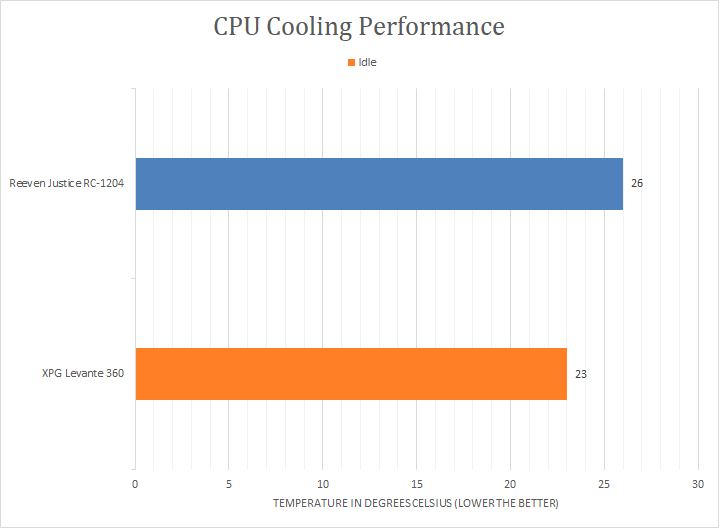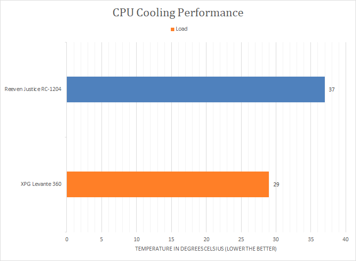The real challenge happened when the CPU was under load. Along with the increased processing speed of the CPU, the fans spun up to match the extra heat generated. After about half an hour, the XPG Levante 360 kept the temperature constant at 29 degrees Celsius. Today’s review unit outperformed both the RC-1204 with a noticeable advantage. The RC-1204 only utilize one cooling fan on the heatsink compared to the triple 120mm fans for the Levante 360, so this is expected. Meanwhile, the use of radiator also increased the cooling efficiency of those fans. The Reeven Justice was a solid cooler in of itself, and we know the Levante 240 has performed well in the past, giving the bigger Levante 360 great street credibility.