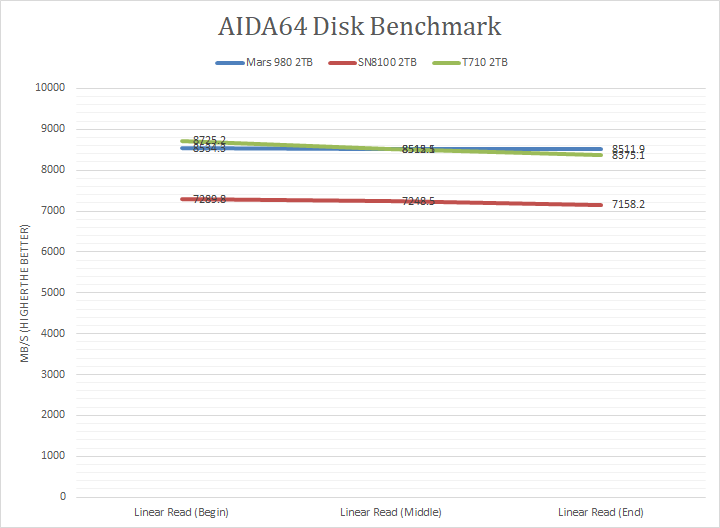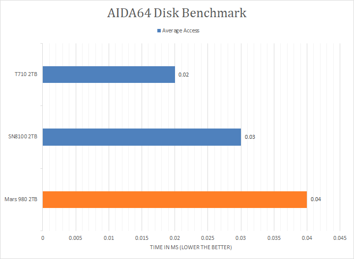 As you can see in our graphs above, the XPG Mars 980 Blade 2TB scored consistently around the 7200MB/s mark in the linear read segment, putting it about 1GB/s behind the Sandisk WD_BLACK SN8100 2TB and Crucial T710 2TB. In Buffered Read, the T710 came in first, while the SN8100 and Mars 980 were around the same ballpark. The Mars 980 Blade came in the middle in the Buffered Read segment. The tested latency was very low with an average of 0.04ms. The comparison results for all the other drives can be seen in our graphs above.