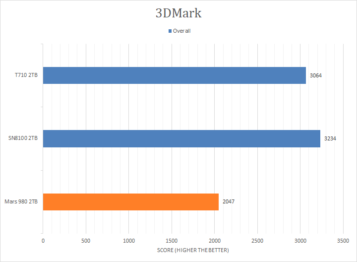 3DMark is the continuously updated version of the popular gaming benchmark from UL. We used 3DMark's Storage Benchmark to test the performance of the XPG Mars 980 Blade 2TB. According to UL, the Storage Benchmark uses traces recorded from popular games and gaming-related activities to measure real-world gaming performance. The following traces were used and defined as follows: