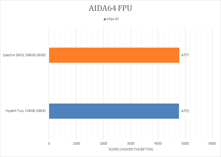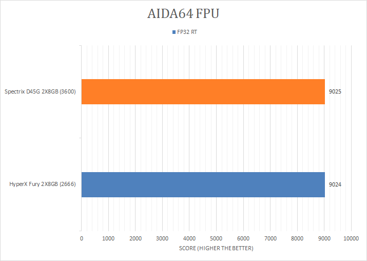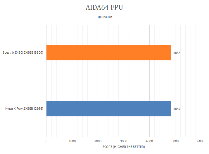 Now, let us move on to the second set of tests in the AIDA64 Engineer benchmark, which is the FPU test. It is worth noting that the floating-point unit test is more about CPU performance than a RAM test. In theory, there should be very limited difference between the two sets of RAMs since the CPU was the same for both tests. In fact, if you look at the above results, you can see that all five results were identical between the XPG Spectrix D45G and the HyperX Fury HX426C16FB3K2/16. The differences were all within 1%.