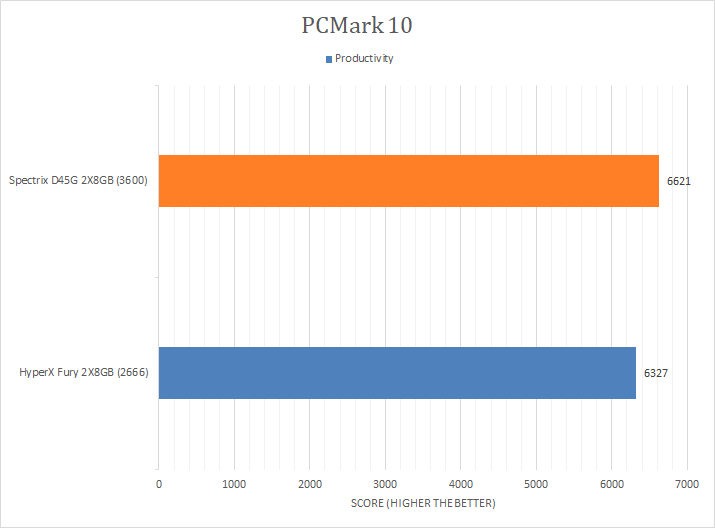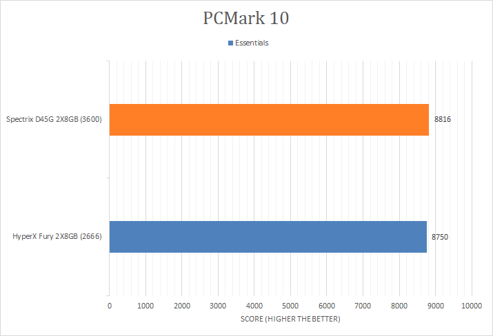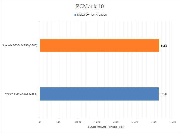 PCMark 10 is the latest version of the popular full system benchmark from UL. An extended benchmark run provides scores in four categories, which includes Essentials, Productivity, Digital Content Creation, and Gaming. Those four categories basically conclude all the aspects a typical computer user may encounter on a daily basis. From the above results, we can see the XPG Spectrix D45G had better performance in all four aspects, thanks to the higher operating speed. It is worth pointing out in the productivity test, the XPG Spectrix D45G delivered about 5% higher score than the HyperX Fury HX426C16FB3K2/16, while for the other three tests, the differences were all within 2%.