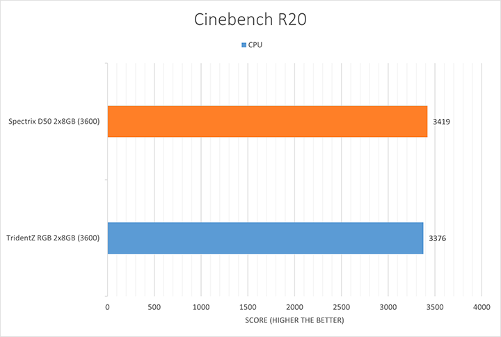 Cinebench R20 is Maxon's latest benchmark to measure CPU rendering performance. The GPU test was dropped by the developers because it has been considered as irrelevant in the benchmarking scene for a while now. As the subtitle suggests, this test depends heavily on the CPU, but it does not necessarily mean that the RAM modules will not contribute anything. This is proven by the results, where we saw a somewhat noticeable lead by the XPG Spectrix D50 DDR4-3600 2x8GB.
