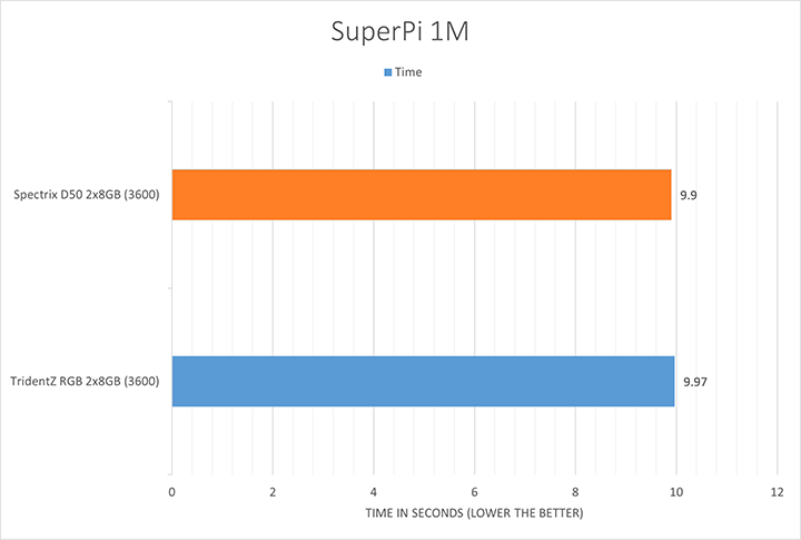 We have always included SuperPi in our benchmark results, because it is a quick and dirty run that always proves to be interesting. It is neither the fastest way to calculate pi nor is it the most challenging. Being an enthusiast at heart, this program has always provided interesting results for showing off your overclocking prowess on your favorite online platform. Looking at the results, the XPG Spectrix D50 DDR4-3600 2x8GB just barely outperformed the G.Skill TridentZ RGB DDR4-3600 2x8GB. It reasonable to conclude that the difference here is negligible with just a 0.07 second difference.