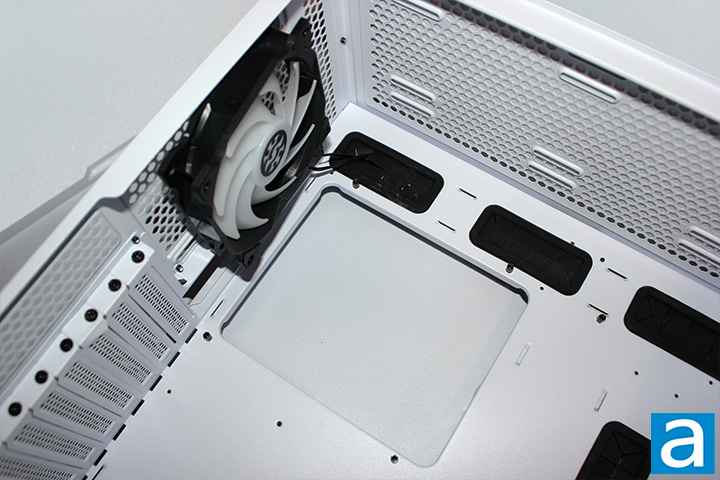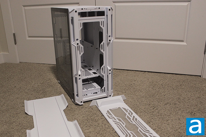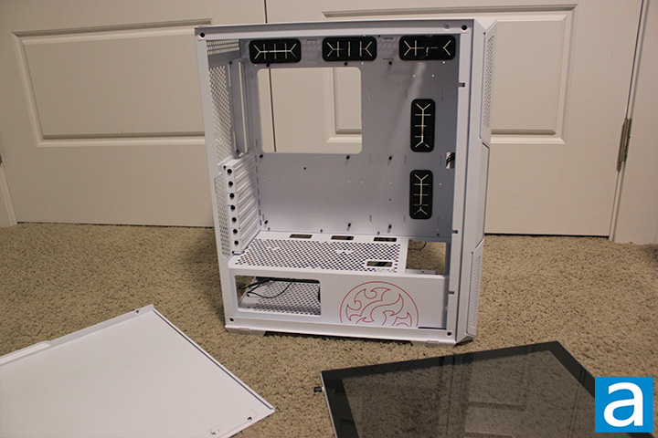 To remove the two side panels of the XPG Starker, there are four captive thumbscrews: Two for the front tempered glass panel and two for the back panel. The captive thumbscrews are a nice addition as I have a dark-colored desk and they can be difficult to locate when set down. The panels slide off the case towards the back when the screws are loosened. Both the front and back panels are secured quite snug and therefore require some force to pull out. The tempered glass has an opaque black border that allows you to remove the panel without leaving fingerprints behind. The back panel is flat and has a small handle to assist you in removing it. The interior of the case is evenly coated in white with some black accents. There is an XPG logo printed in red on the power supply chamber. The chamber itself has ventilation along the top with openings for motherboard cables to go through, and there is a cut-out on the sides to display your power supply. In addition to covering the power supply, the chamber also houses your storage drives. Ventilation for the power supply comes through from the bottom of the case.