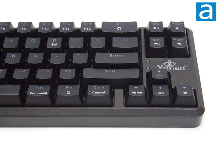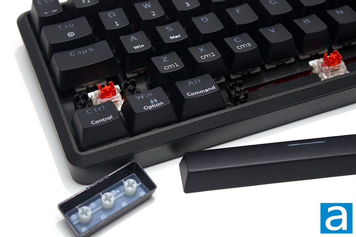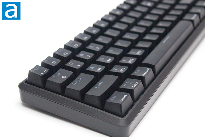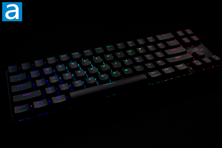 The Yeyian Akil Series 3500 comes with an altered version of the 65% QWERTY ANSI layout. As previously mentioned, the navigation keys are placed in a square above the arrow cluster imitating the appearance of a TKL layout, but in the more compact 65% layout. A typical 65% layout would have the navigation keys placed vertically above the right arrow key and has a total of 68 keys, saving space on your desk by removing the number pad and F-row, while condensing the navigation keys. The QWERT ANSI layout is the standard American layout, which uses the single row enter key, as seen in some of the previous images. The keyboard does have a standard bottom row, meaning that all of the keys in this row are the same size, being 1.25U.