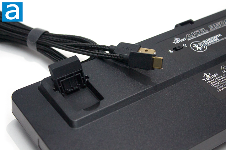 Taking a peek at the bottom of the keyboard, we have four rubber feet and two more on the flip-out feet. The feet on the bottom side are quite large, doing an excellent job of keeping the keyboard in place. There should be no noticeable unintentional sliding. There is no cable raceway to manage the cable on the bottom. The addition would have been nice, but not necessary. The cable plugs in at the bottom using a USB Type-C interface. This is a good thing, as this has become the standard. It is nice to see a braided cable, even on a budget product. This helps with maintaining the product, as you can simply replace one part of the keyboard.