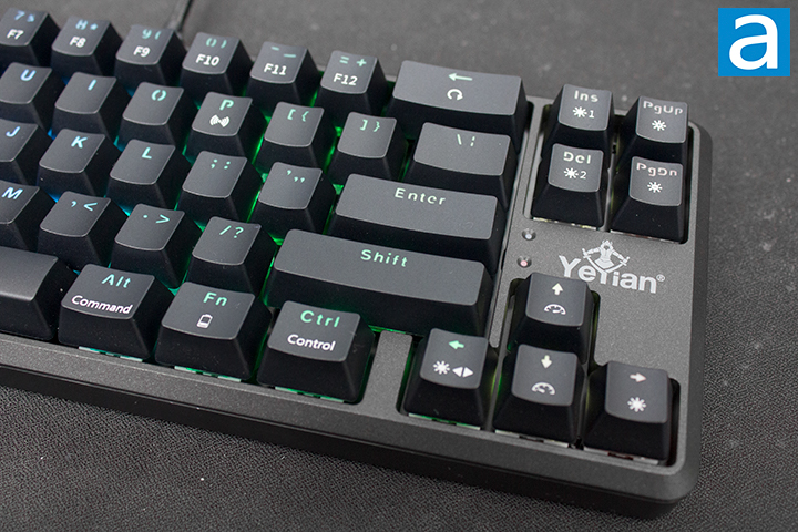 The appearance of the Yeyian Akil Series 3500 is very standard with a slight iteration to the 65% layout. Rather than having the typical four navigation keys placed vertically beside the arrow cluster, Yeyian opts to place the navigation keys in a nice little square. Personally, I find this a little more physically appealing, but that comes down to preference. The exterior is completely made out of a black plastic, giving it a very standard appearance in terms of color. As with many other keyboards, Yeyian places their logo above the arrow cluster. It is the only feasible location to place the logo and have it been still visible with a compact layout such as this one. Another common location that is used is on the front bezel of the keyboard case, but this is typically used for any keyboard with a purely text logo. Generally speaking, the appearance is quite standard in terms of color and material.