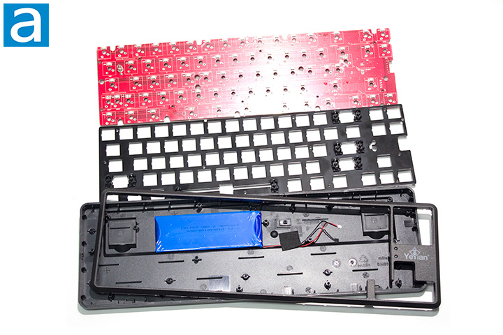 You may have noticed I had merely completed my preliminary inspection. This is because I conducted a full inspection consisting of a complete disassembly of the Yeyian Akil Series 3500. To dissemble the Akil Series 3500, I simply removed 12 screws, unclip the top bezel, extracted the plate and PCB by unplugging the battery, and removed all the switches. The process was quite simple and did not require much know-how. In the image above, you can see how the PCB accepts 3-pin switches, unlike the typical 5-pin switch. As this is a budget keyboard, it makes sense to have budget switches, which commonly come in 3-pin. It is important to note that there are very few brands that can fit inside of these hot-swap sockets, as they are smaller than the typical socket made by Gateron or Kailh. In fact, the sockets used are closer to a Mill-Max socket in design. My personal recommendation for aftermarket switches would be from AKKO, as I have tested the fit to work well with the included hot-swap socket. Upon disassembly is when I noticed how bent the plate truly was. The steel plate was unable to sit flat and mainly bent around the space bar. Looking at the bottom case, you can see several standoffs. Having many standoffs may sound like a great idea, but in actual practice, it makes the typing experience feel quite uneven.